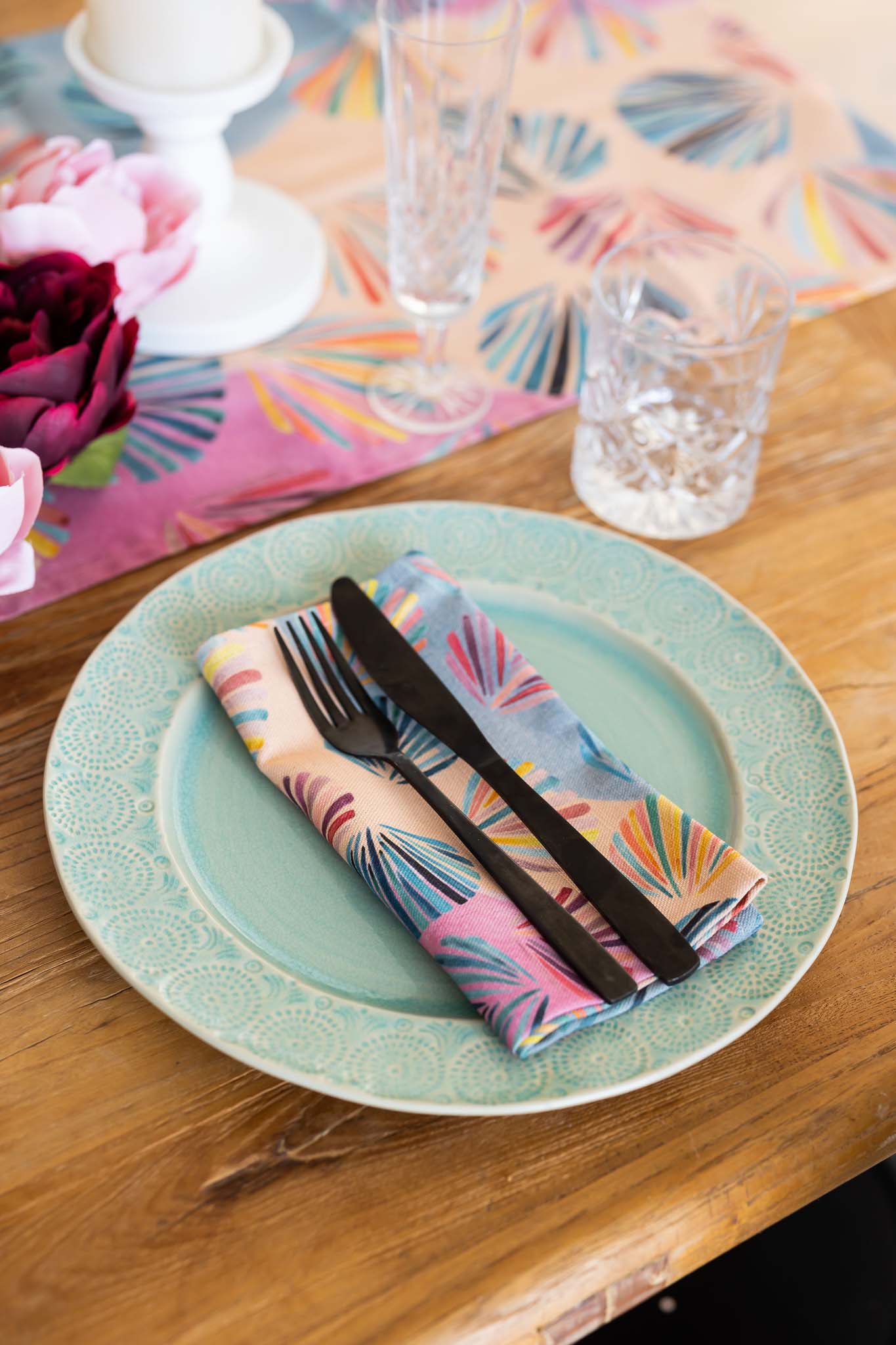 Your table will look beautiful and inviting with this colourful, painterly table runner which looks equally appealing paired with natural, white and earthy ceramics as it does with a celebratory mix-up of colourful glassware, bright flowers and bold candles.